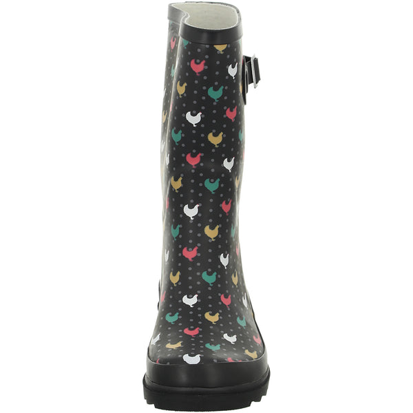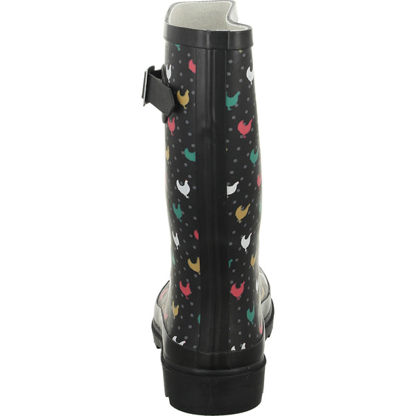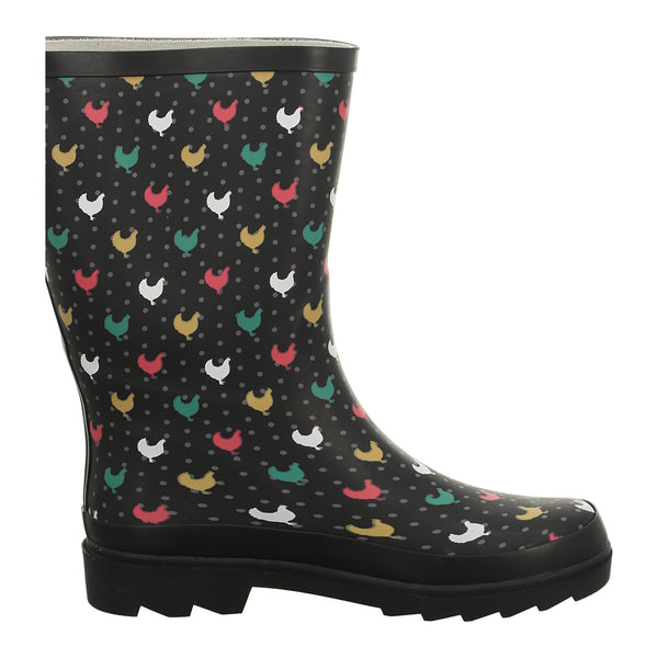 Der Hingucker sind die bunten Hühner auf dem Stiefel.