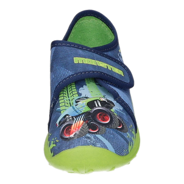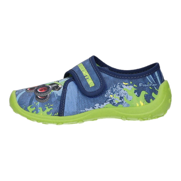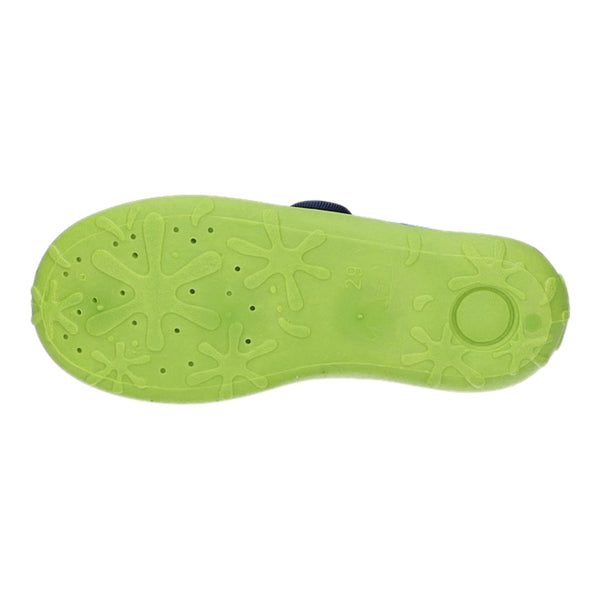 Das Obermaterial besteht aus weichem blau/mehrfarbigem Textil.