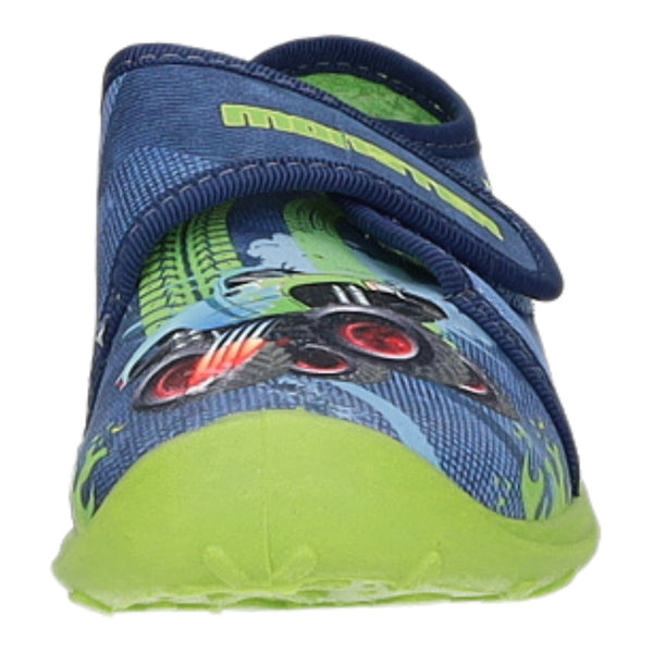 Das Obermaterial besteht aus weichem blau/mehrfarbigem Textil.