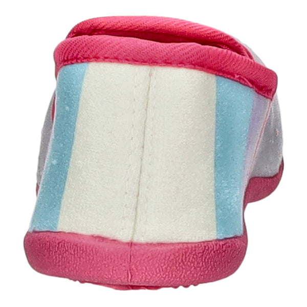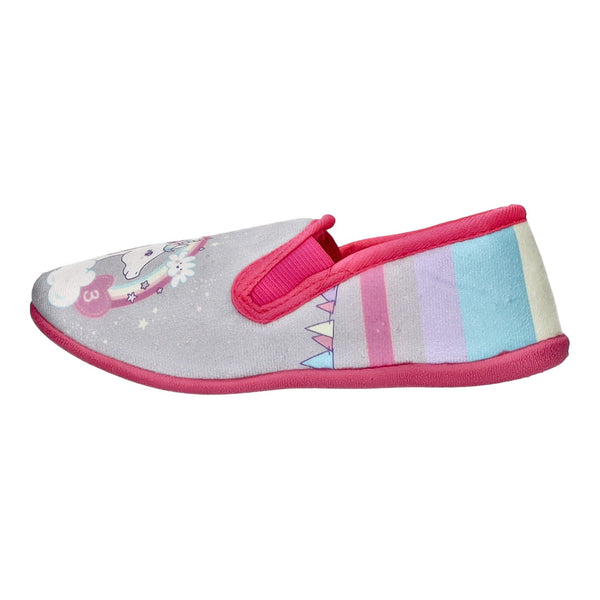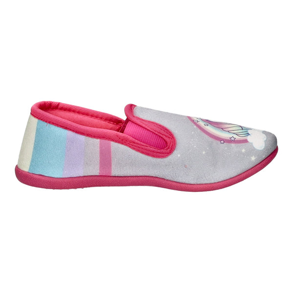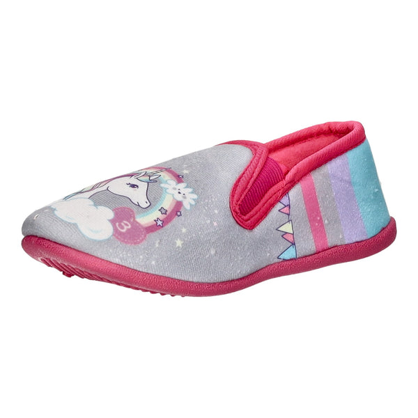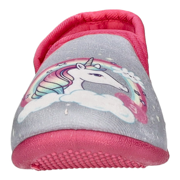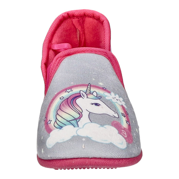Als modisches Highlight ist der Schuh mit einem Einhorn und einem Regenbogen verziert.