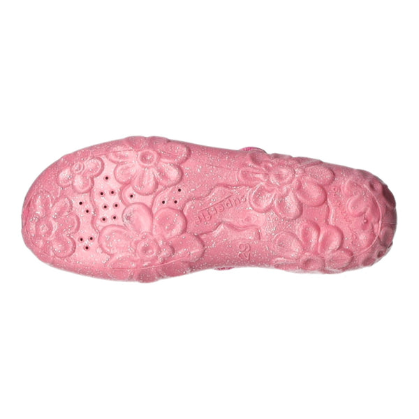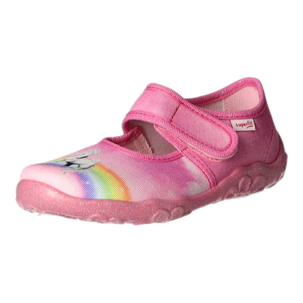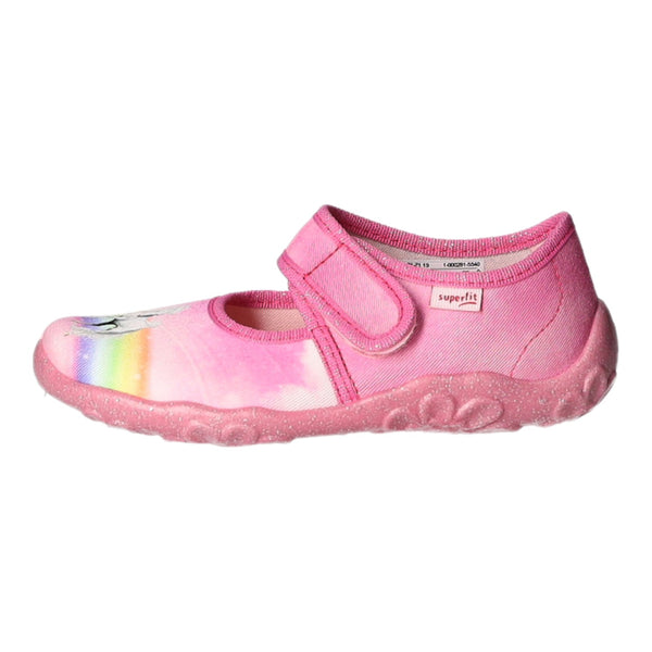 Das Obermaterial besteht aus weichem rosa/mehrfarbigem Textil.