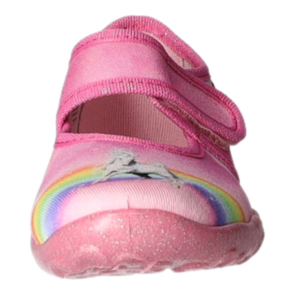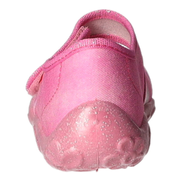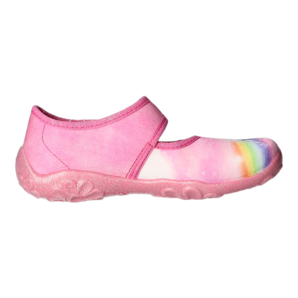 Das Obermaterial besteht aus weichem rosa/mehrfarbigem Textil.