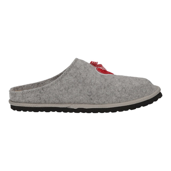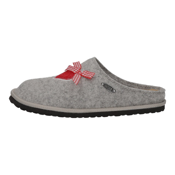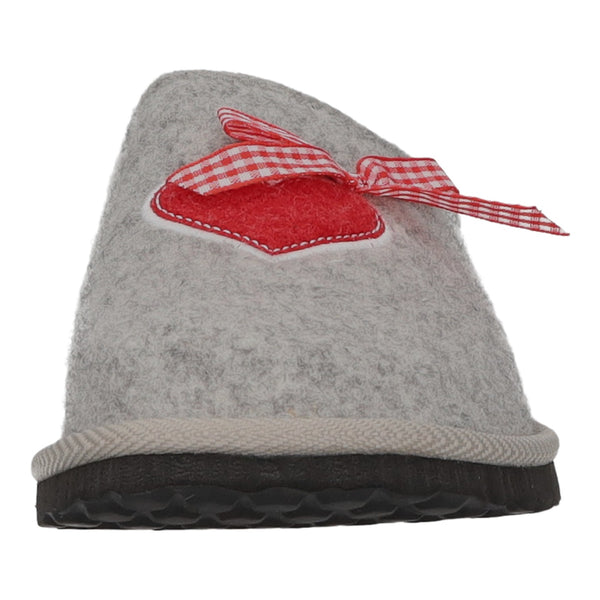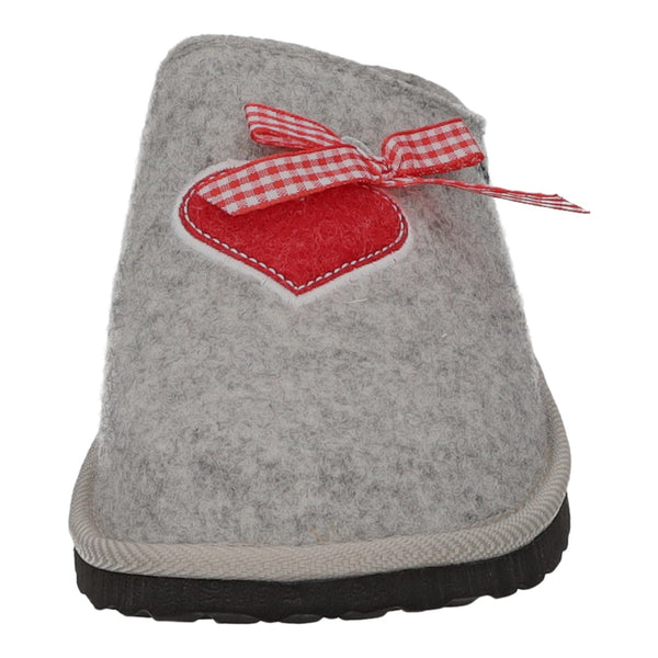 Der Schuh ist mit einem Herz und einer Schleife verziert.