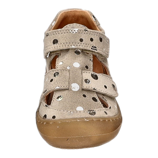 Als modisches Highlight ist der Schuh mit goldenen Punkten verziert.
