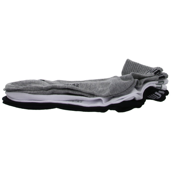 Sie bekommen drei Paar Socken in grau/weiß/schwarz.