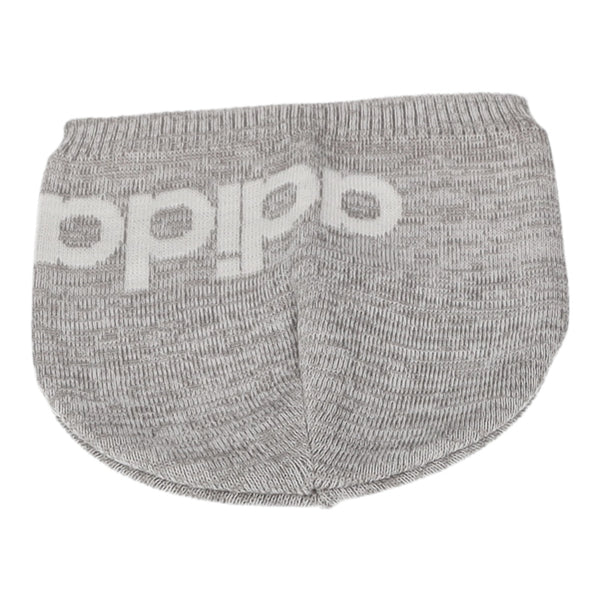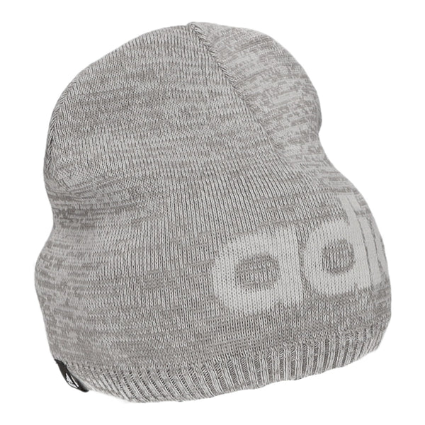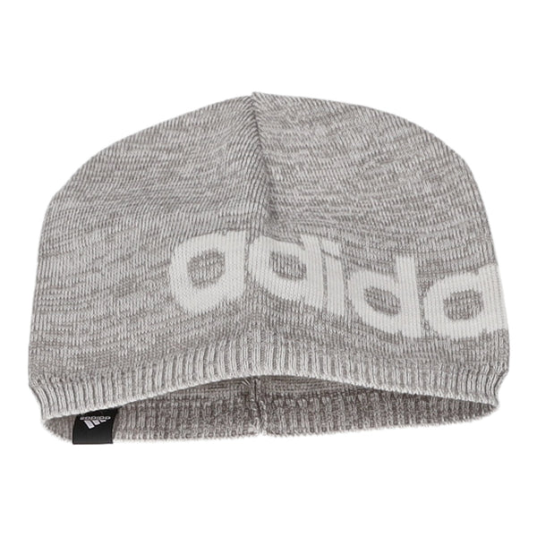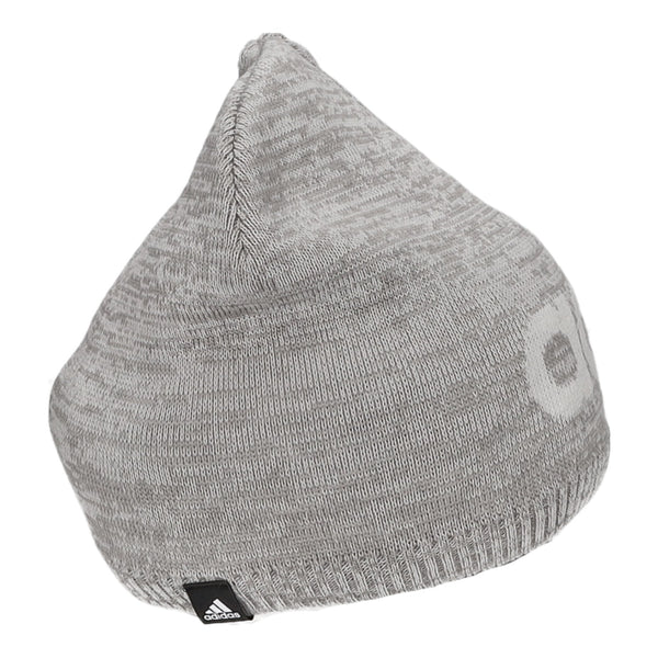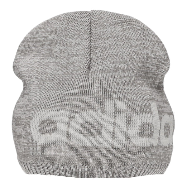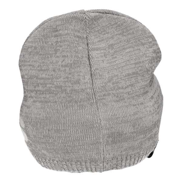 Der Beanie ist aus grau/weißem Textil gefertigt.