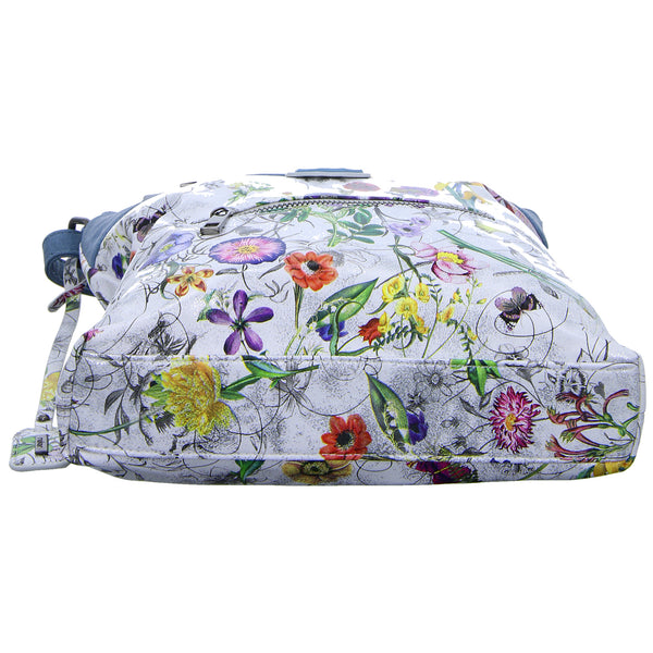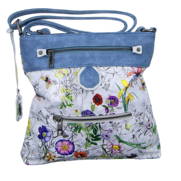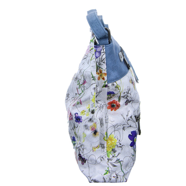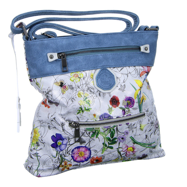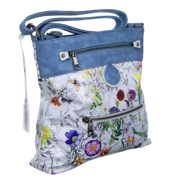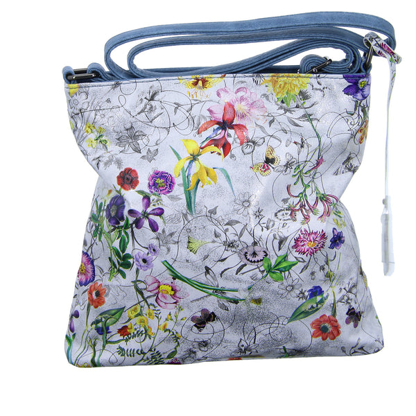 Die metallic Optik als auch der Blumenprint macht diese Tasche zum Hingucker.
