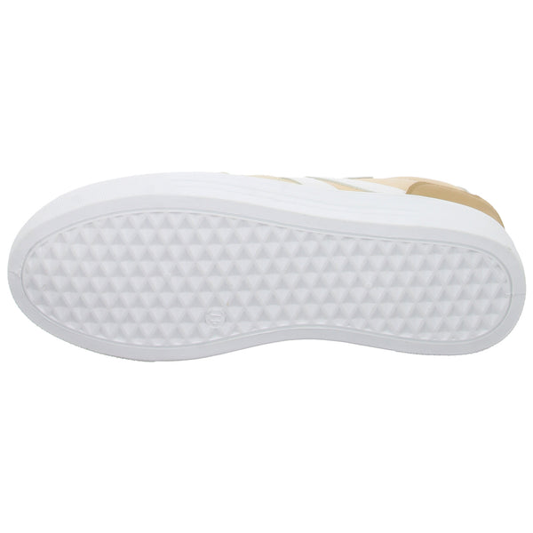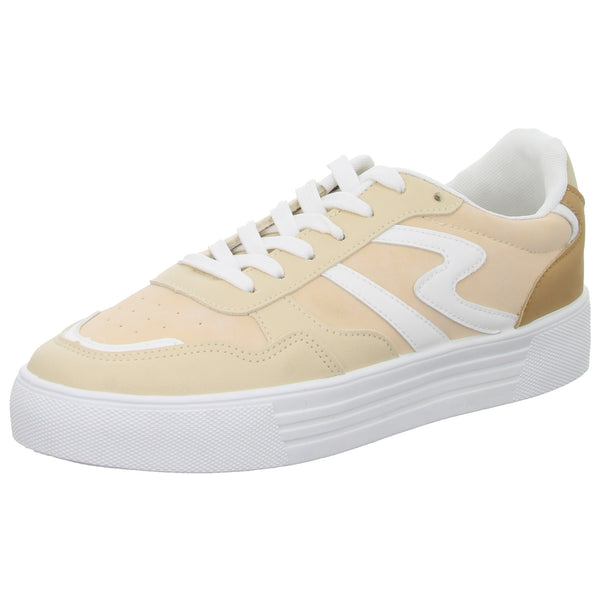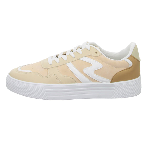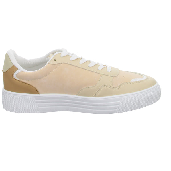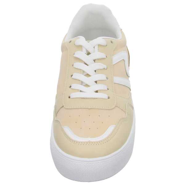 Das Obermaterial besteht aus hochwertigem im Grundton beigem glattem Kunstleder.
